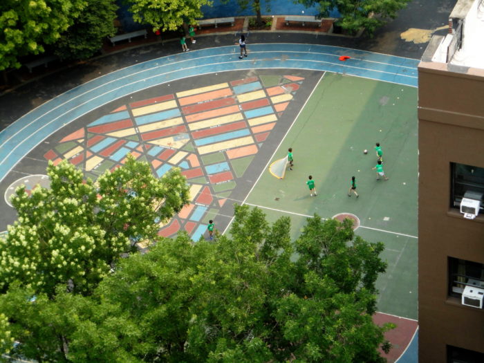 You probably see marked on the ground the two basketball half-courts on the left and the blue track that curves beside them. You’ll also see a colorful block pattern inside the track. Let’s look a little closer: