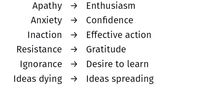 among other emotional transformations. It helps people replace hopelessness, helplessness, guilt, shame, despair, and so on with rewarding emotions that motivate more sustainability.
