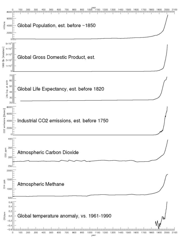 Here’s a plot from his article you can probably understand without explanation, suggesting we’re off the charts on many environmental measures. Even if we’re still in sustainable territory, the rate of change is beyond unprecedented. Come to think of it, I’ll include a graph podcast guest Tom Murphy made that he considers his most important just below, so scroll down.