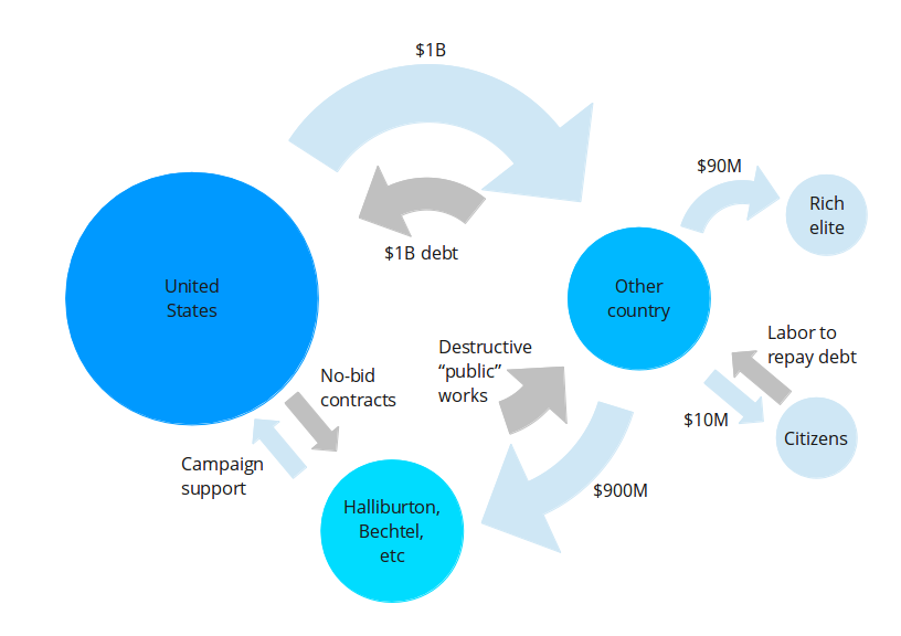 Why would the U.S. lend so much money to a country than can’t repay it? First, the amounts are small compared to the U.S. economy. Next, the money never makes it to the smaller county. Almost all of it goes to U.S. companies like Halliburton, GE, Bechtel, and so on, who support the members of the U.S. government supporting the scheme. Members of the Reagan and both Bush cabinets are the same population as those company’s top executives.