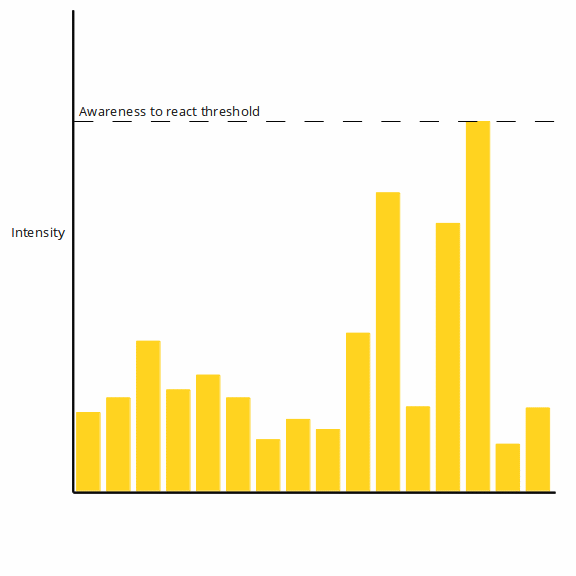 With experience you’ll keep the low threshold even at high intensity, as in a graph like this, illustrating someone with high awareness despite living in an intense environment.