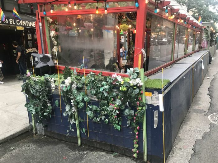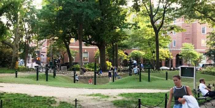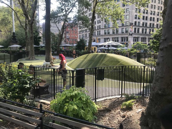 Kids are supposed to play on that plastic instead of grass. There is so little green space with living green plants that the grass around the plastic is worn away, turned to desert.