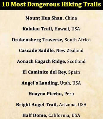 December 26: Subject: 10 Most Dangerous Hiking Trails. I’ve done 3 of the 4 in the US (Yosemite, Grand Canyon and Zion) – have to add the rest to my bucket list: